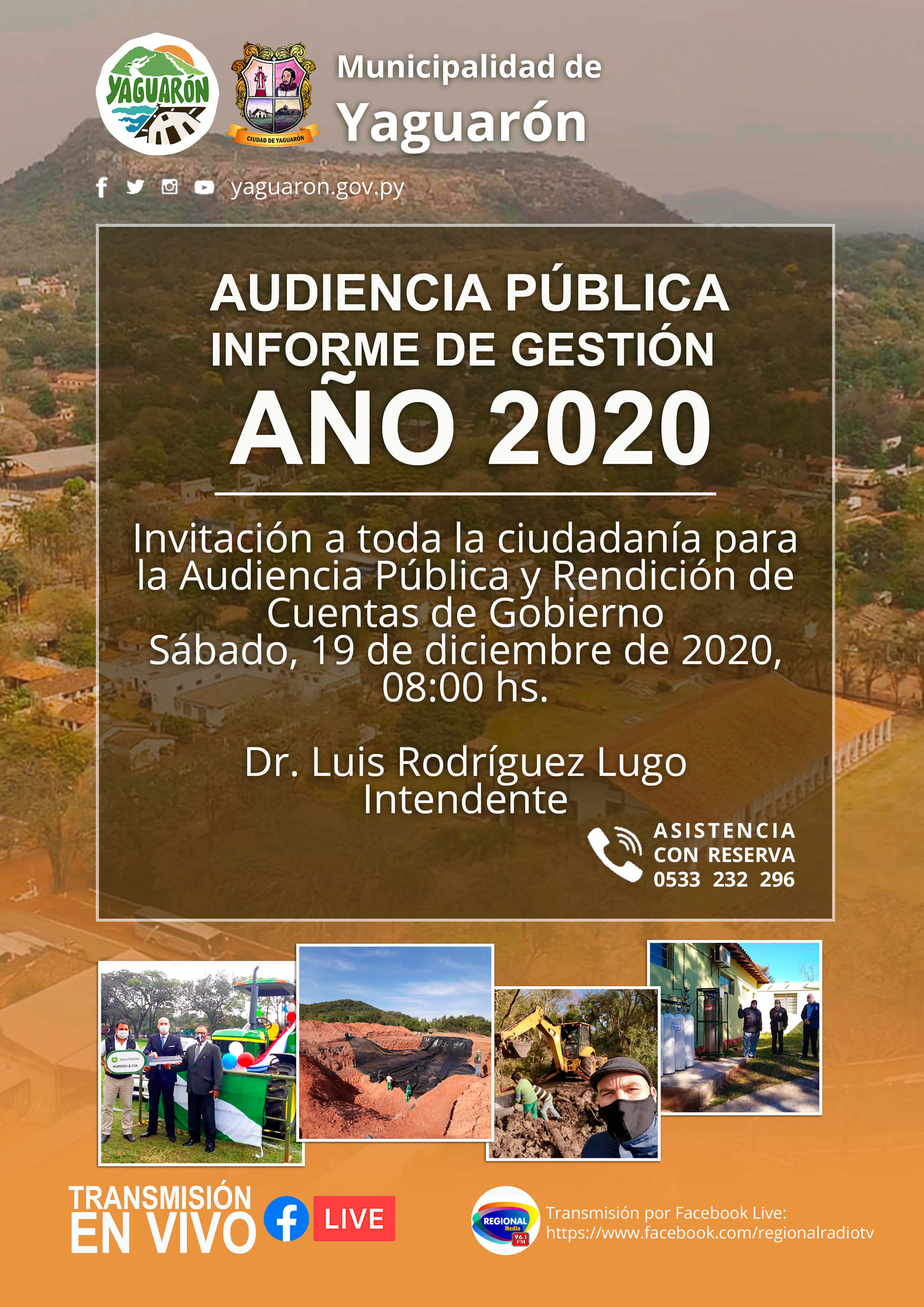 La Intendencia Municipal invita a la ciudadania en general a ser participe de la Audiencia Pública y Rendición de Cuentas de la Gestión 2020, a llevarse a cabo este sábado 19 de diciembre a partir de las 08:00 hs. Asistencia con Reserva 0533 232 296.