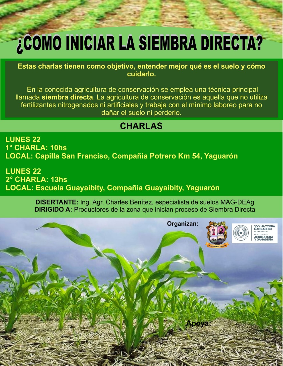 CHARLA POR EL ESPECIALISTA EN SUELOS DEL MAG-DEAG CHARLES W. BENÍTEZ F. La siembra directa para mejorar el rendimiento de la producción y la calidad del suelo agrícola es una de las acciones que el Ministerio de Agricultura y Ganadería desarrolla y capacita, organizada por la Municipalidad de Yaguarón.