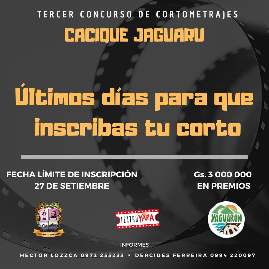 Faltan 3 días para el cierre de nuestra convocatoria. ¡Animate y presentá tu cortometraje! Tercer Concurso de Cortometrajes CACIQUE JAGUARU, organizado por la Municipalidad de Yaguarón y el Elenco Teatro YARA.