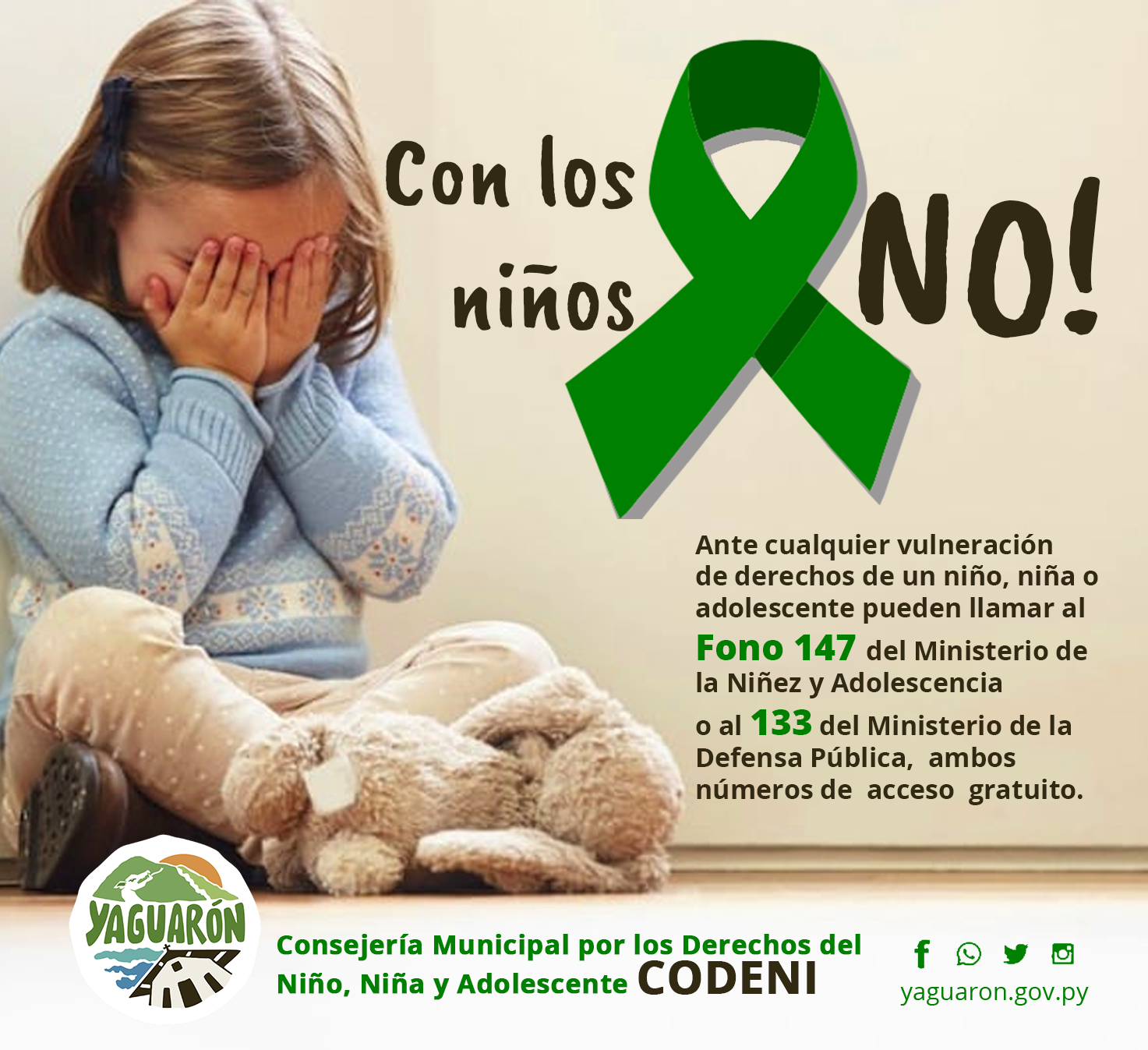 Ante cualquier vulneración de derechos de un niño, niña o adolescente pueden llamar al Fono 147 del Ministerio de la Niñez y Adolescencia o al 133 del Ministerio de la Defensa Pública, ambos números de acceso gratuito.