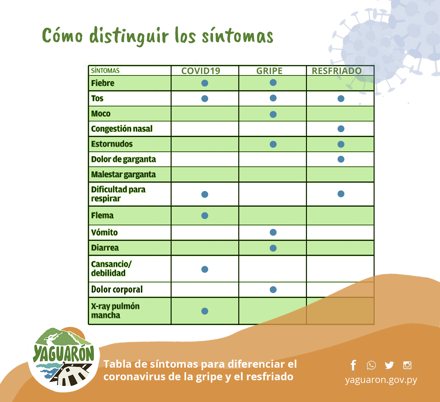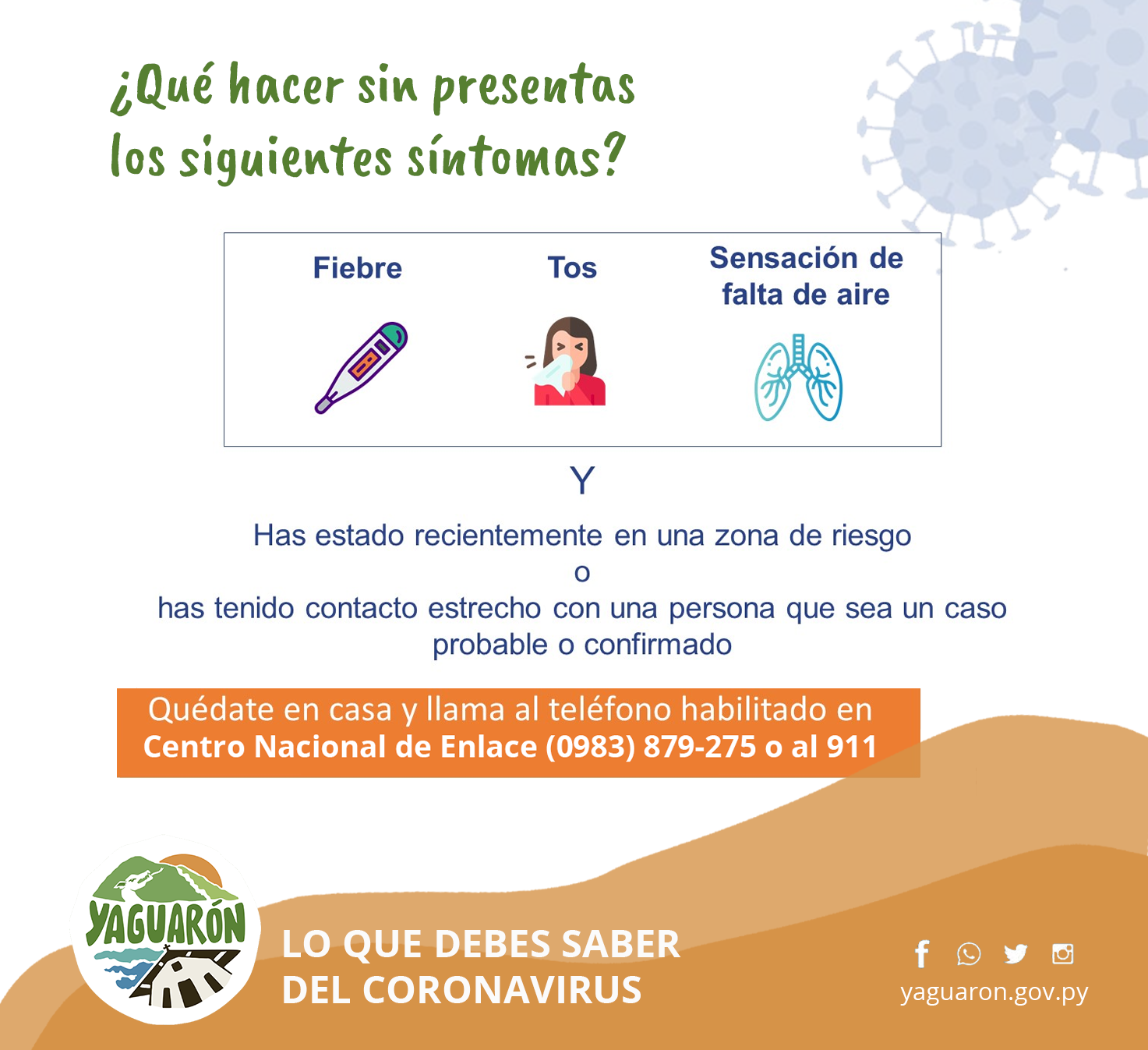 En caso que presentes cualquier síntoma del coronavirus o en contacto con una persona con enfermedad respiratoria (confirmada) y presentás algunos síntomas como tos, fiebre y dolor de garganta podés llamar al Centro Nacional de Enlace (0983) 879-275 o al 911