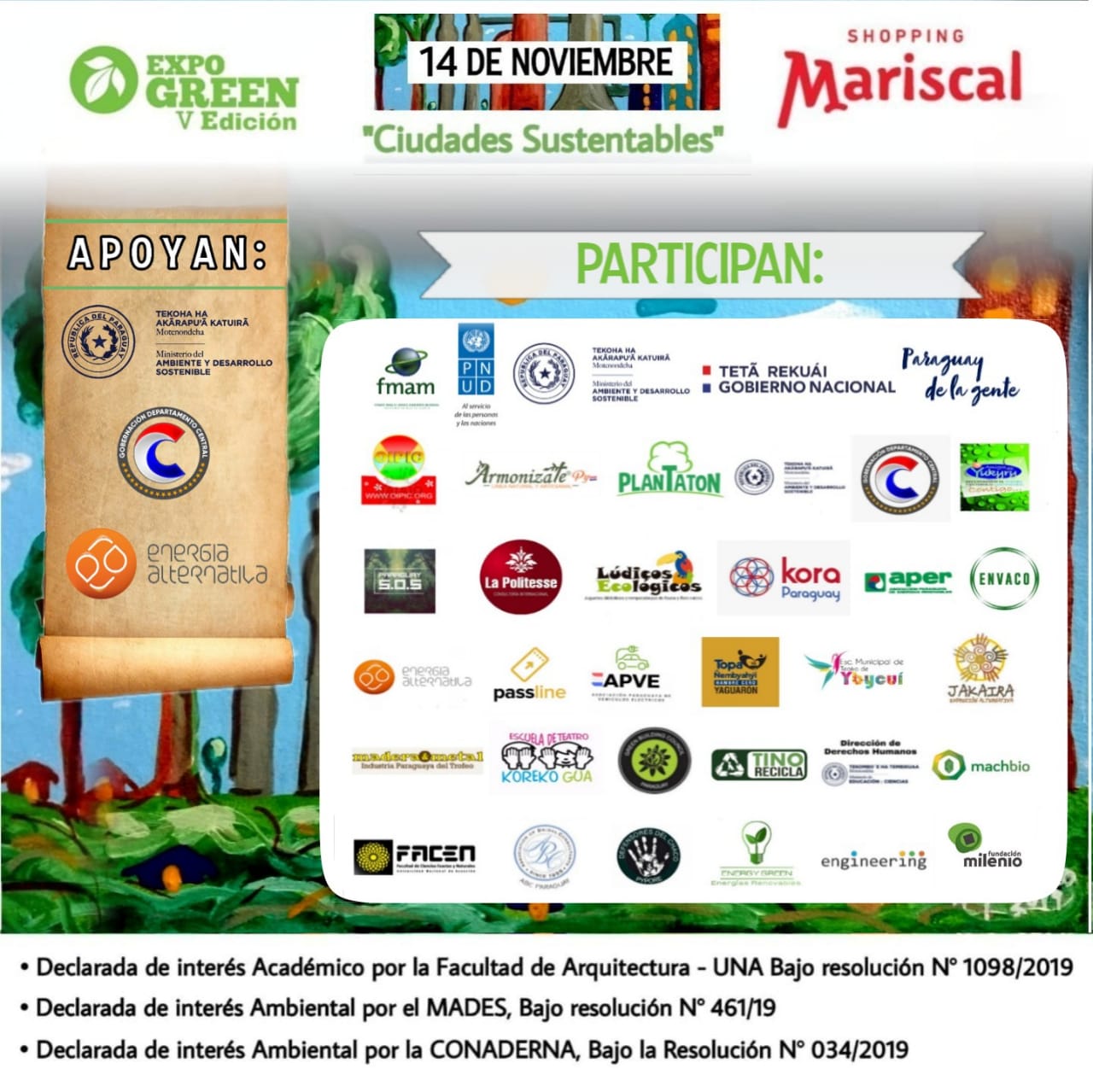 Participantes y expositores: OIPIC; Plantatón, Aromatízate, Gobernación de Central. Ministerio del Ambiente y Desarrollo Sostenible. Paraguay SOS, Amigos del Yukyry, La Politesse, Envaco, Asociación paraguaya de energías renovables, Energias Alternativas, Kora Paraguay, Lúdicos Ecológicos, Asociación Paraguaya de vehículos eléctricos, PassLine, Madera y Metal, Escuela de Teatro koreko Gua, Jakaira, Topa Ñembyahyi de Yaguarón, Escuala Municipal de teatro de Ybycui, Paraguay Green Building Council, Facen, Tino Recicla, Machbio, Defensores del Chaco, Dirección de Derecho Humanos del MEC, Ernergy Green.