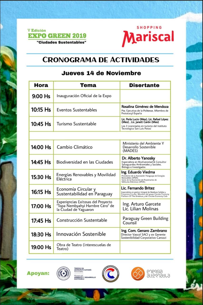 La Expo Green, desde su primera edición, cuenta con el respaldo de instituciones como el MADES (Ministerio del Ambiente y Desarrollo Sostenible), Gobernación Central, Fiscalía del Ambiente, Corte Suprema de Justicia en la Dirección de Medio Ambiente, como así también empresas comprometidas con el medio ambiente, instituciones públicas y privadas, artistas plásticos y artesanos que participan con stanes donde muestran a los visitantes las tareas que realizan; además durante la feria se desarrollaran diversas actividades: como charlas para estudiantes, debates sobre los temas más importantes o controversiales, seminarios con profesionales en las áreas, danza y música en vivo con artistas de primer nivel, degustaciones y otras promociones.