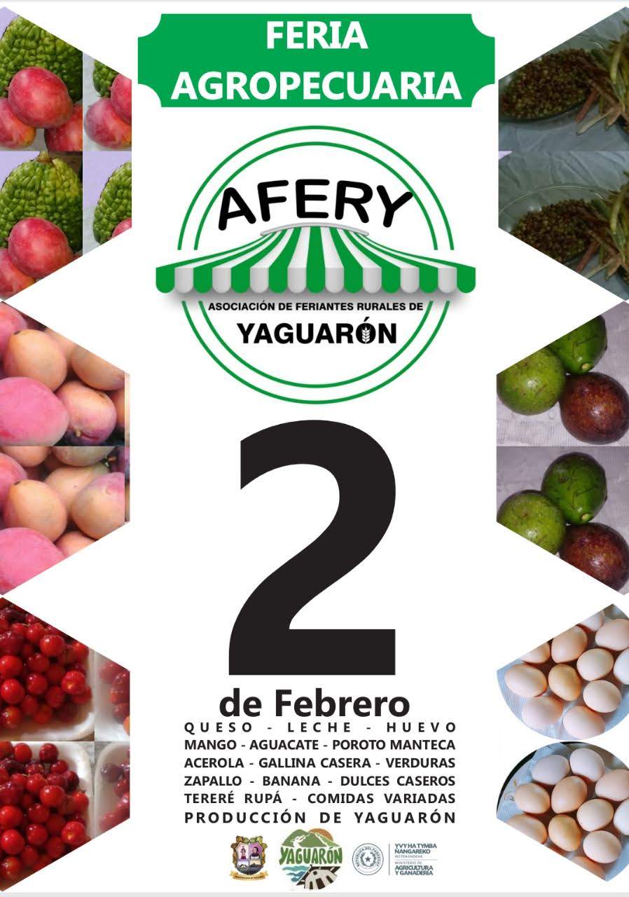 ORGANIZAN: La Municipalidad de Yaguarón y LA AFERY( Asociación de Feriantes Rurales Yaguaroninos les esperamos a todos, con los productos más frescos y saludables como queso, leche, aguacate, poroto manteca, acerola, gallina cacera, verduras, zapallo, banana, dulces caseros, terere rupa, comidas variadas producción de Yaguarón!!! No faltes!!!