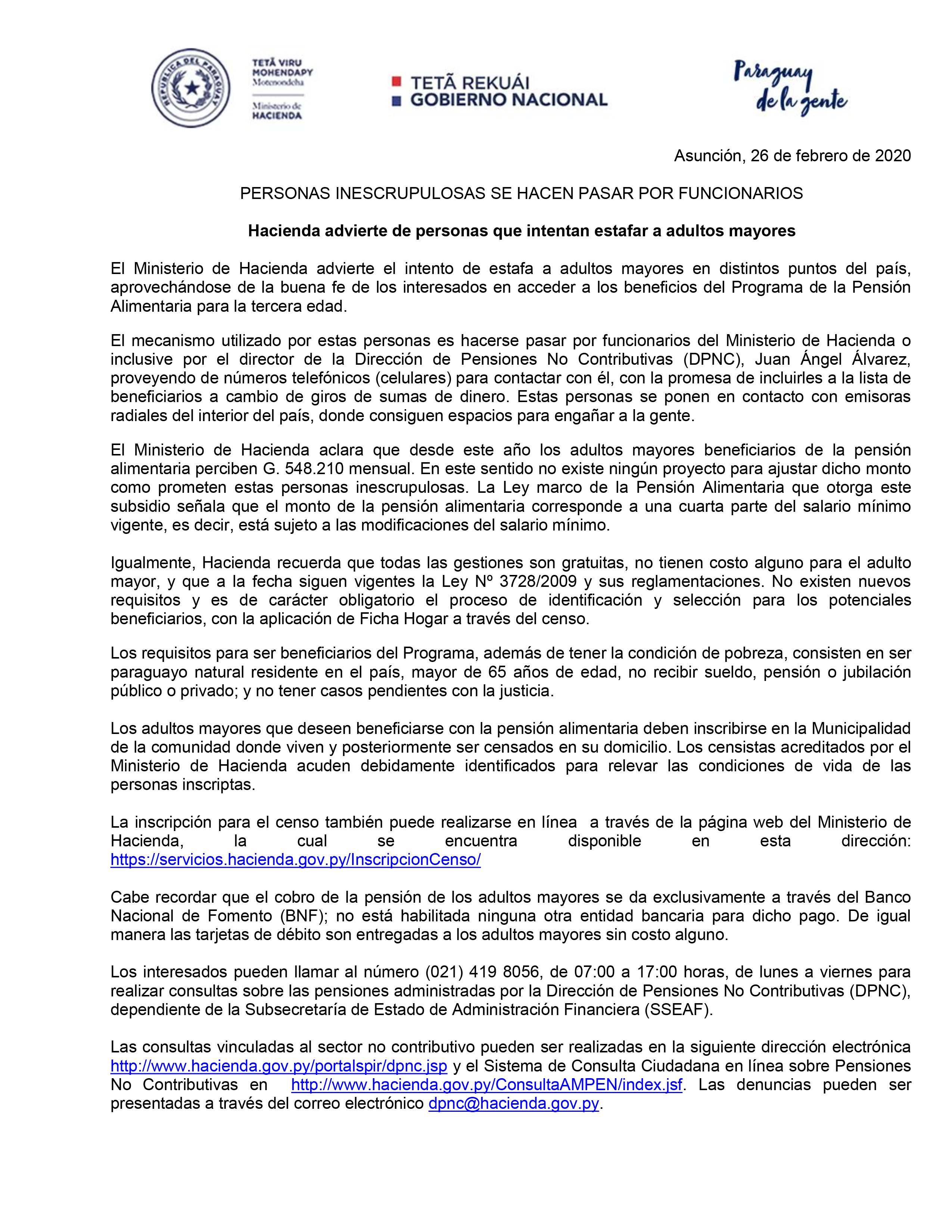 Los interesados pueden llamar al número (021) 419 8056, de 07:00 a 17:00 horas, de lunes a viernes para realizar consultas sobre las pensiones administradas por la Dirección de Pensiones No Contributivas (DPNC), dependiente de la Subsecretaría de Estado de Administración Financiera (SSEAF).
