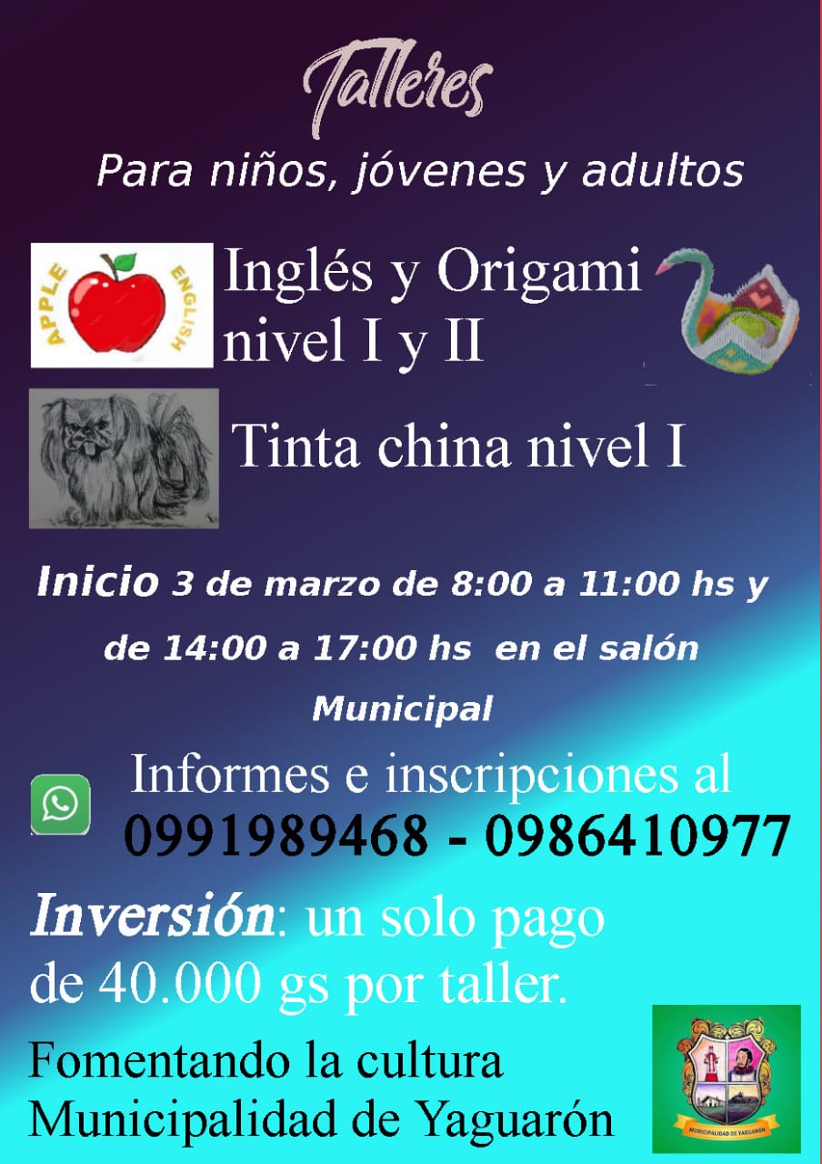 Este año de nuevo tenemos talleres de capacitación para todas los niños, jóvenes y adultos que Inicia 03 de marzo en el Local de Municipalidad de Yaguarón.