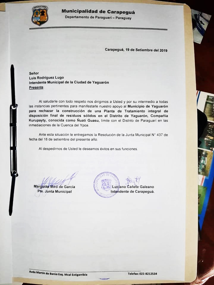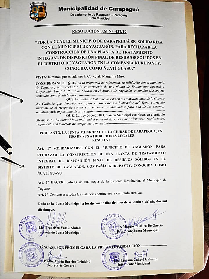 Agradecemos a la Municipalidad de Carapeguá por el acompañamiento al pueblo Yaguaronino atravez de una resolución diciendo » No al Vertedero en nuestra ciudad»