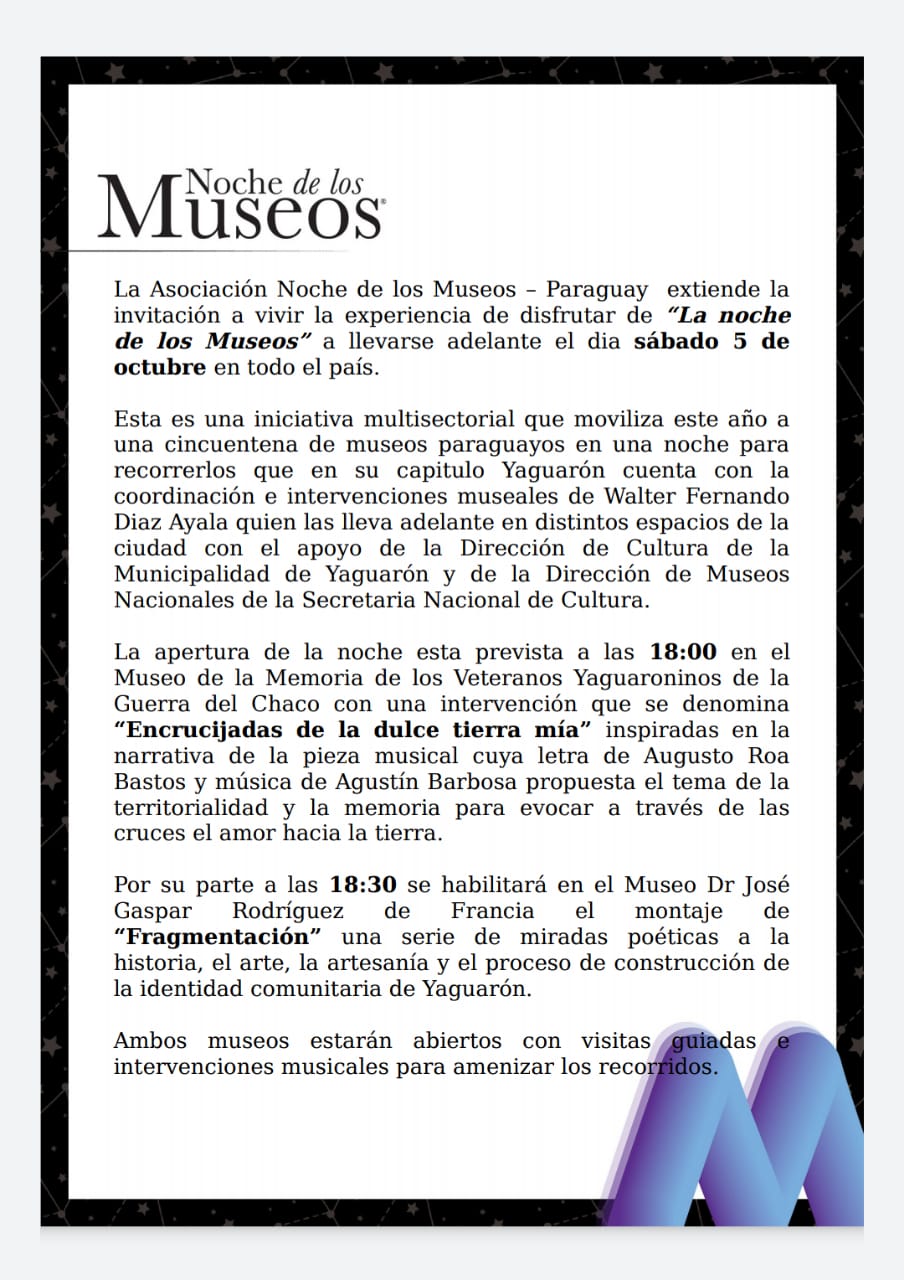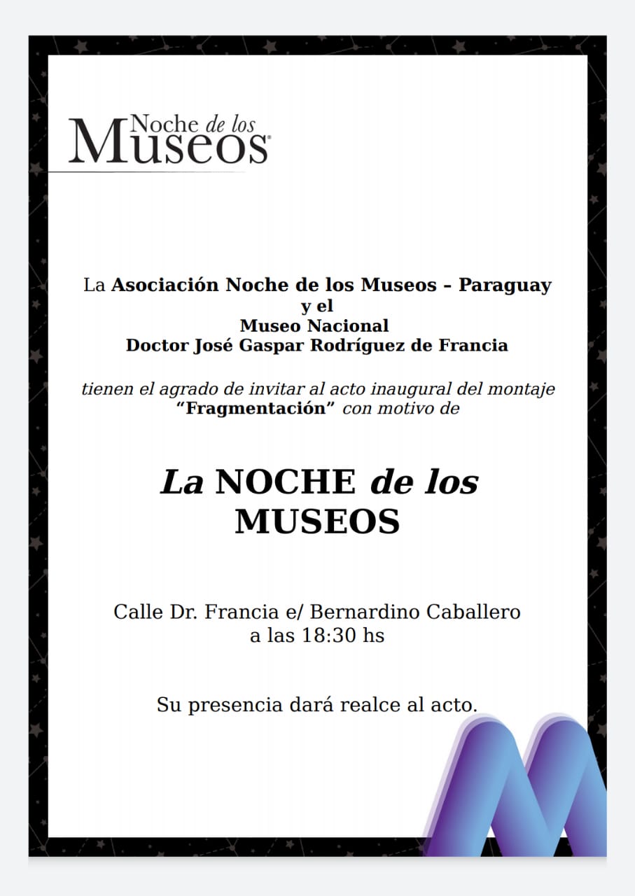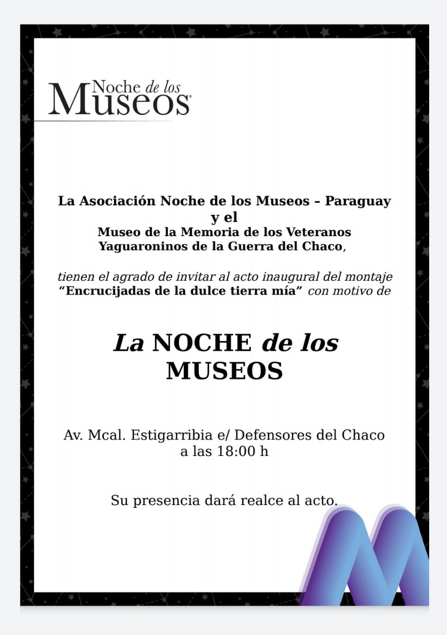 La Asociación Noche de los Museos-Paraguay y el Museo de la Memoria tienen el agrado de invitar al acto inaugural el día sábado 5 de octubre, montaje “ENCRUCIJADAS DE LA DULCE TIERRA MÍA” con motivo de la noche de los museos. Con el apoyo de la Dirección de Cultura de la Municipalidad de Yaguarón.