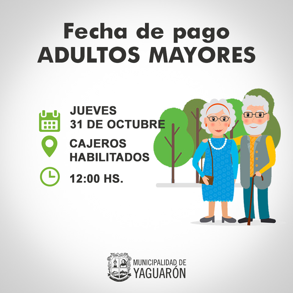 La municipalidad de Yaguarón comunica que Hacienda procederá al PAGO DE PENSIÓN PARA ADULTOS MAYORES correspondientes al mes de octubre este jueves 31 a partir de las 12:00 hs