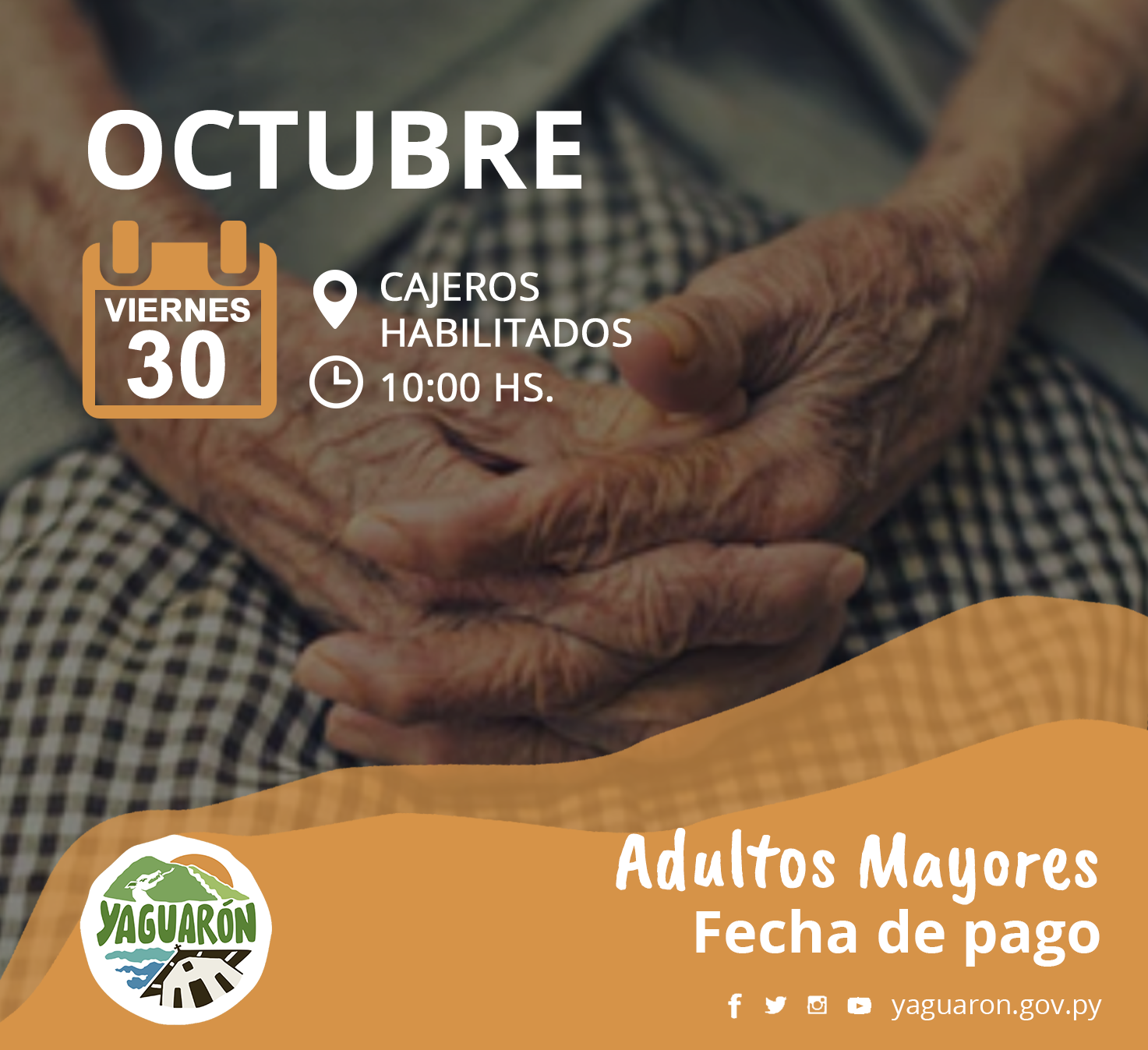 La Municipalidad de Yaguarón comunica a los Adultos Mayores que los pagos de pensiones alimentarias estarán habilitados el día viernes 30 de octubre del corriente año en curso. Los pagos se harán a través de los cajeros automáticos autorizados por el Banco Nacional de Fomento (BNF). Cabe recordar que para el día de pagos se insta a las personas a cumplir con los requerimientos necesarios del protocolo sanitario ante el Covid-19.