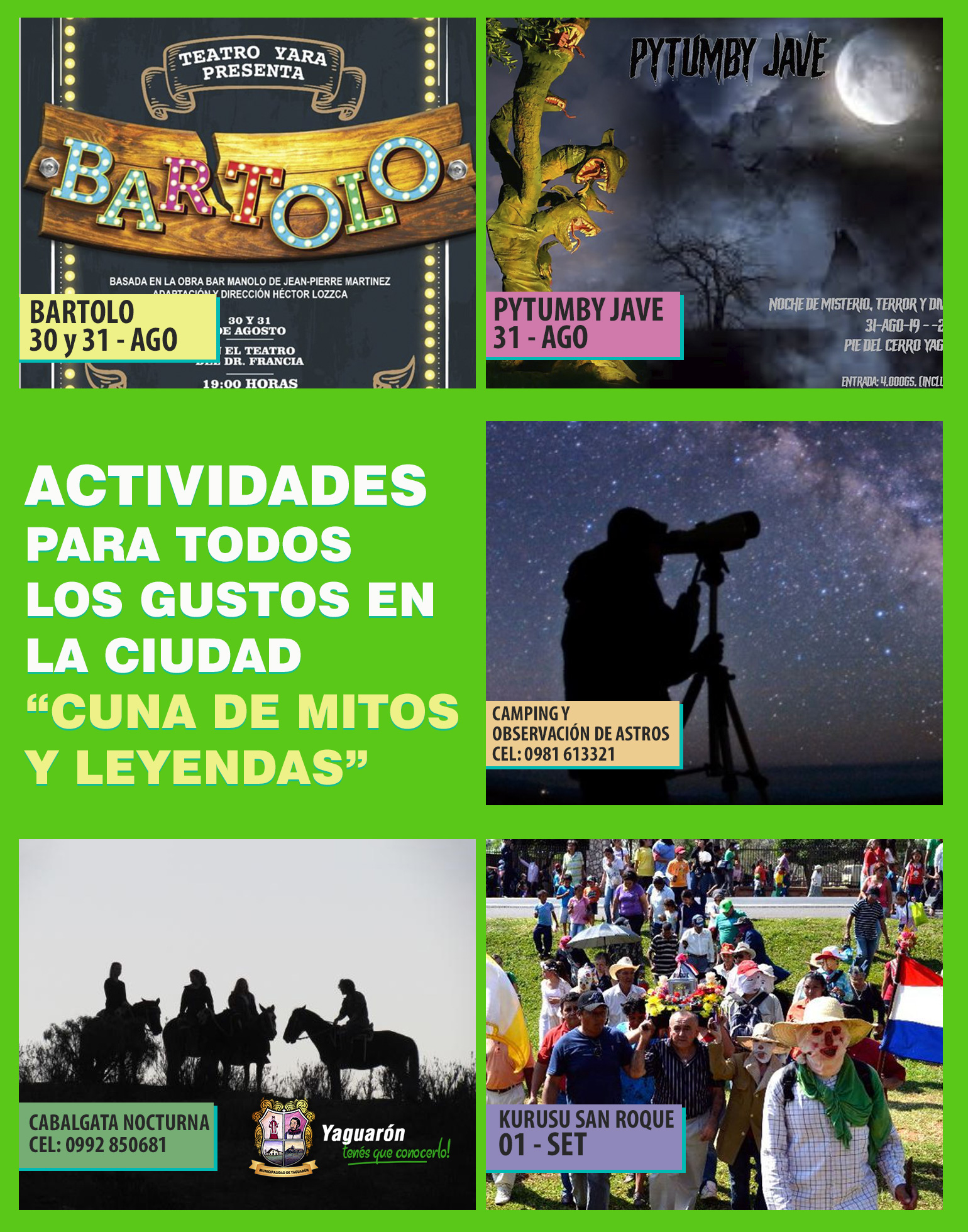 Con el objetivo de fortalecer la oferta turística de la ciudad “Cuna de Mitos y Leyendas”, la Municipalidad de Yaguarón, Consejo de Turismo de Yaguarón, Tierra Viva Cultura, Teatro YARA, Ecodomo Yaguarón y la Comisión de Informadores INFOTUR Yaguarón, preparan una variada muestra de actividades combinadas para todos los gustos!!