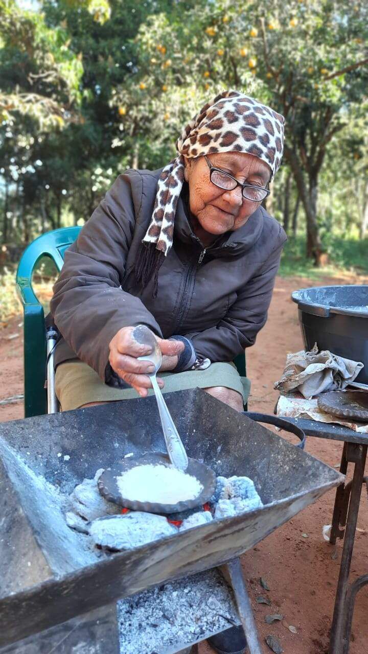 Rosalina Robles muestra el proceso de cocción del mbeju tova.