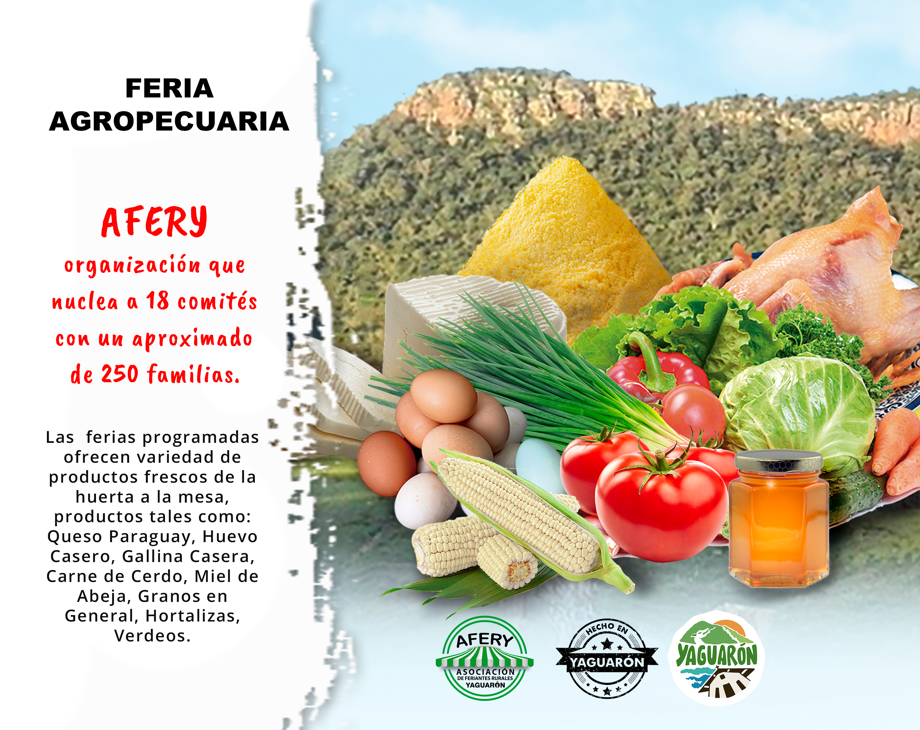 Productos hortigrangeros y artesanales, se ofrecen en las ferias programadas, variedad de productos frescos de la huerta a la mesa, productos tales como: Queso Paraguay, Huevo Casero, Gallina Casera, Carne de Cerdo, Miel de Abeja, Granos en General, Hortalizas, Verdeos.