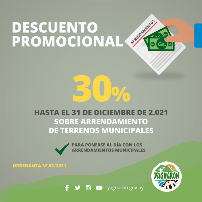 Según la Ordenanza Municipal 02/2021 que establecen nuevas condiciones de arrendamientos y ventas de terrenos municipales. !!!APROVECHEN LA OPORTUNIDAD !!! hasta fin de año.