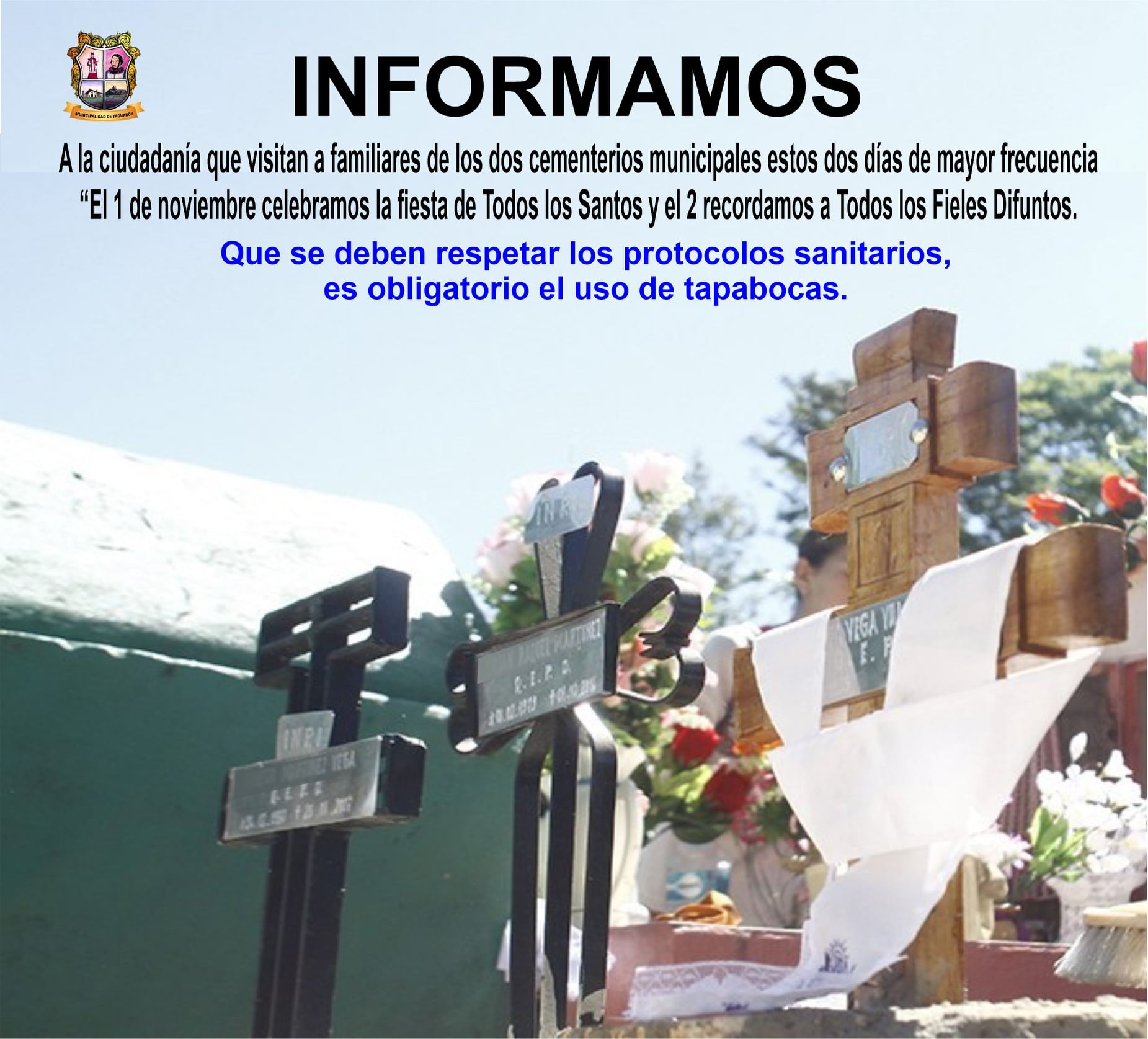 El Departamento de Necrópolis de la Municipalidad de Yaguarón informa que se exigirán la higiene de manos y el uso obligatorio de tapabocas para las visita estos días de celebración de todos los Santos el 1º y el 2 de noviembre día de todos los fieles difuntos.