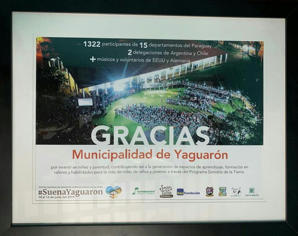Nos sentimos sumamente emocionados al recibir la distinción a la Municipalidad y al pueblo yaguaronino por la excelente organización y sede privilegiada del Gran Festival Nacional de Orquestas Juveniles de Sonidos de la Tierra, #SuenaYaguarón2019.