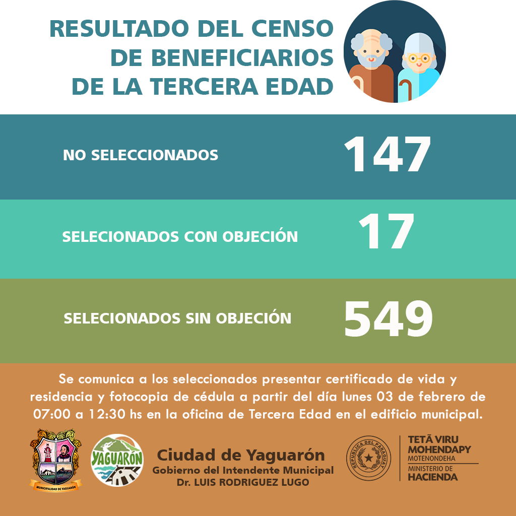 Se comunica a los seleccionados presentar certificado de vida y residencia y fotocopia de cédula a partir del día lunes 03 de febrero de 07:00 a 12:30 hs en la oficina de Tercera Edad en el edificio municipal.