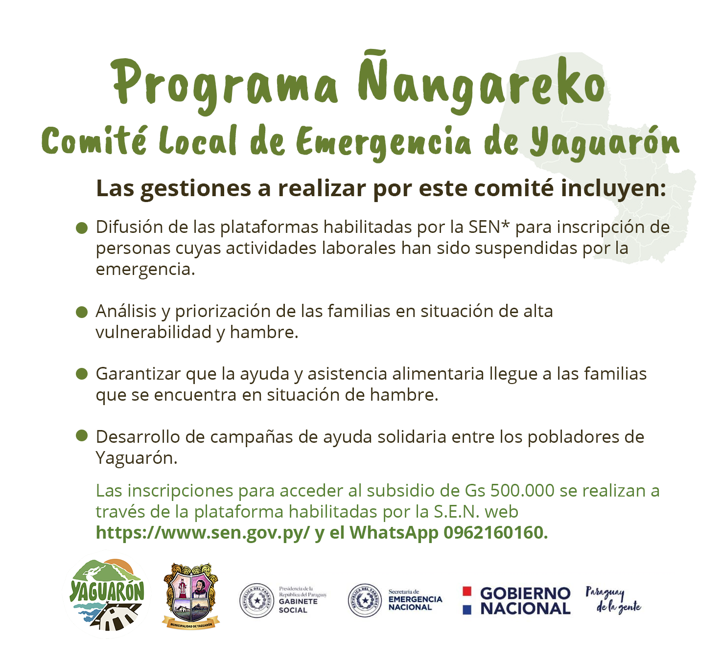 En cumplimiento a la Ley 2615/2005 de la SEN (Secretaría de Emergencia Nacional), integrado por representantes del sector público, privado y social de Yaguarón, con el objetivo de gestionar y canalizar acciones que minimicen el impacto generado por la Pandemia del virus COVID-19.