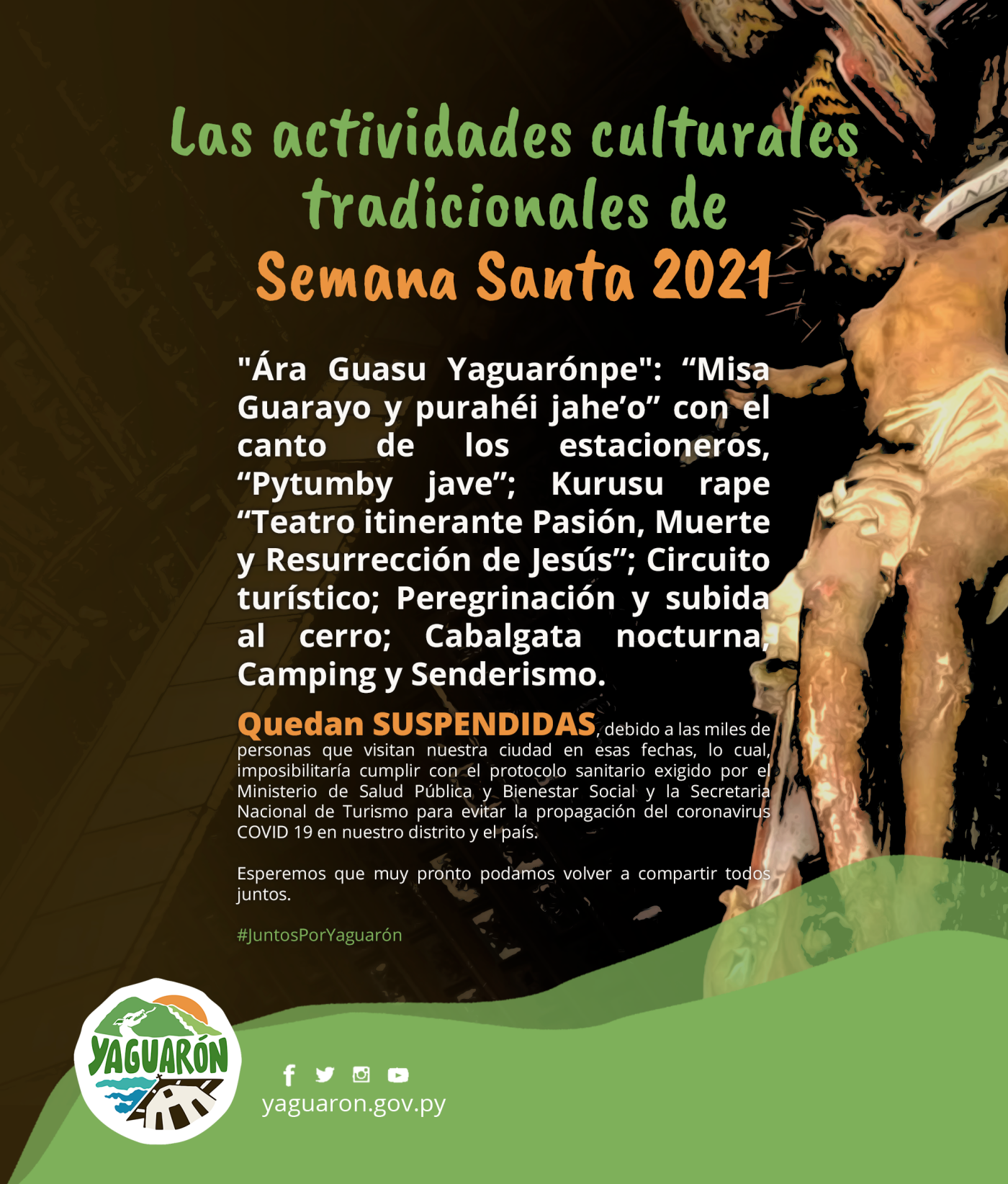 La municipalidad de Yaguarón comunica a la ciudadanía en general que las actividades culturales tradicionales de Semana Santa «Ára Guasu Yaguarónpe«: “Misa Guarayo y purahéi jahe’o” con el canto de los estacioneros, “Pytumby jave”; Kurusu rape “Teatro itinerante Pasión, Muerte y Resurrección de Jesús”; Circuito turístico; Peregrinación y subida al cerro; Cabalgata nocturna, Camping y Senderismo, quedan SUSPENDIDAS, debido a los miles de visitantes que visitan nuestra ciudad en esas fechas, lo cual, dificultaría cumplir con el protocolo sanitario exigido por el Ministerio de Salud Pública y Bienestar Social y la Secretaria Nacional de Turismo para evitar la propagación del coronavirus COVID 19 en nuestro distrito y el país.