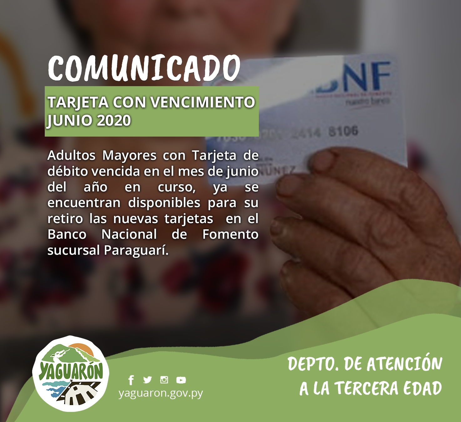 La Municipalidad de Yaguarón informa a los adultos mayores con tarjeta de débito vencida en el mes de junio del año en curso, que ya se encuentran disponibles para su retiro las nuevas tarjetas, en el Banco Nacional de Fomento sucursal Paraguarí.
